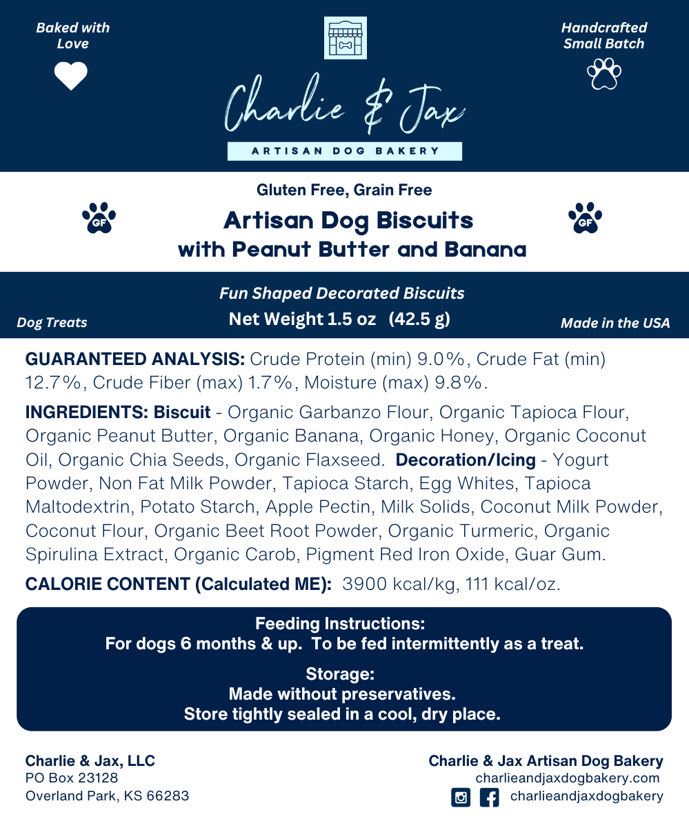 Crunchy biscuit treats that are fun and delicious! These treats combine yummy all-natural peanut butter and flavor-filled ripe bananas and come decorated in various seasonal shapes and colors. These biscuits smell and taste great and have the added nutritional benefits of chia seeds, flaxseed meal, and honey. Made with organic ingredients.