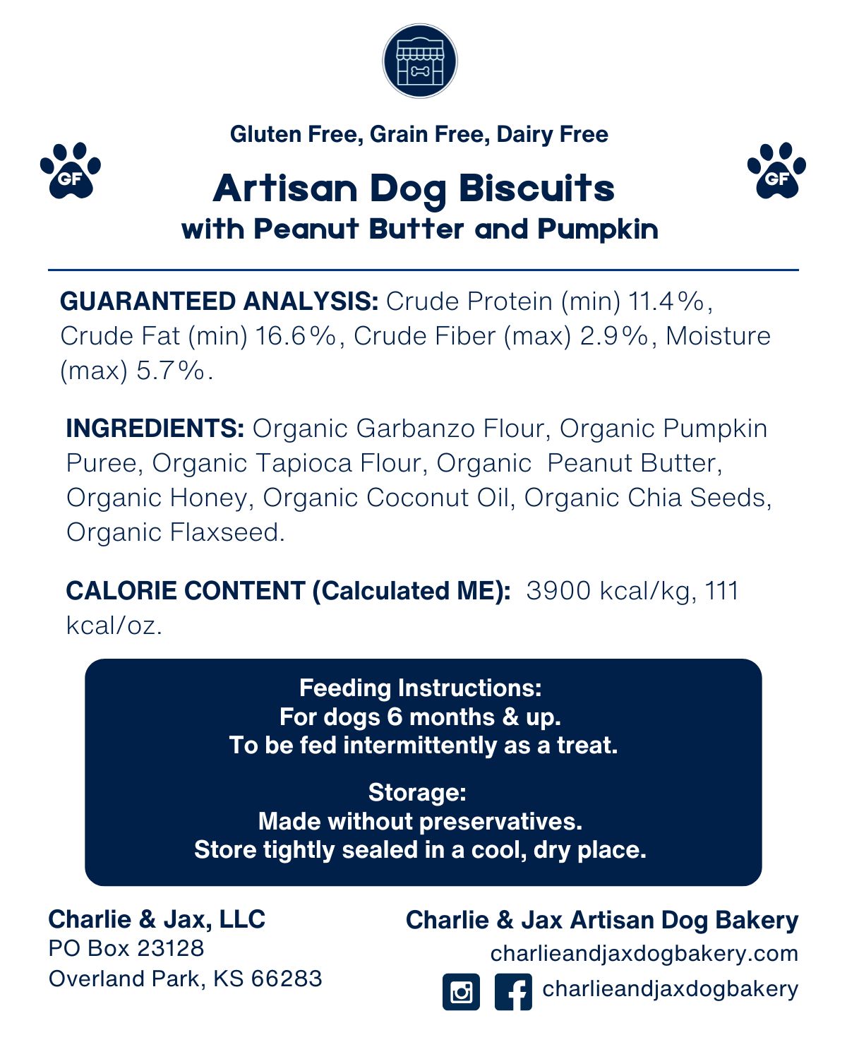 Organic Garbanzo Flour, Organic Pumpkin Puree, Organic Tapioca Flour, Organic Peanut Butter, Organic Honey, Organic Coconut Oil, Organic Chia Seeds, Organic Flaxseed Meal.